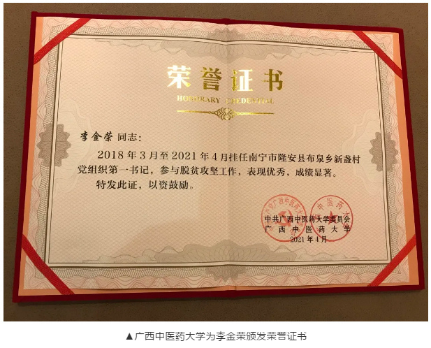 从自治区督查暗访指出问题,到不折不扣落实整改,再到最后顺利通过每年的自治区“四合一”各项检查,扎根乡村的李金荣,不忘初心、牢记使命,勇于担当、甘于奉献,发挥自身优势带领全村贫困户脱贫摘帽、脱贫致富,为推动脱贫攻坚做出应有的贡献。特别是面对突如其来的新冠肺炎疫情,他积极响应号召,迎难而上、“逆行”回村,与驻地干部群众一同构筑起群防群治的坚固防线,为统筹推进疫情防控和脱贫攻坚作出了重要贡献,获评为“南宁市优秀贫困村党组织第一书记”。面对荣誉,他常说:“我是一名党员,也是贫困村党组织第一书记,更是农民的儿子,只有把乡亲们装在心里才是不忘初心”。