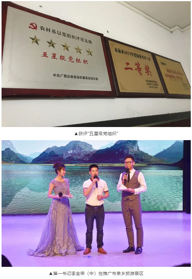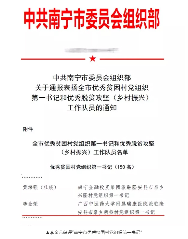 “80后”第一书记李金荣,2012年退役后进入广西中医药大学附属瑞康医院工作,2018年3月份,被组织派驻隆安县布泉乡新盏村担任贫困村党组织第一书记,他上接“天线”找项目、寻资金,下连“地气”聚人心、带队伍,心里惦记的是民情冷暖,脑里琢磨的是富民强村,紧紧依靠后援单位特色和力量,誓将贫困村旧貌换新颜。三年多来,在他的带领以及后援单位的支持下,新盏村"两委"履职能力和服务群众水平得以提升,基础设施不断得到完善,村集体经济收入逐年增加,村民看病就医问题得到有效缓解。2020年3月,为彻底打赢扶贫攻坚战,不让一名贫困群众掉队,李金荣主动向组织请缨,继续留守一年,为实现全村全员脱贫站好最后一班岗。