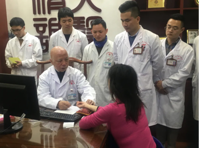 韦贵康看诊时,旁边围了一大圈徒弟,聚精会神,边看边记。韦贵康教徒弟,要求十分严格,最起码的就是上课、上班不能迟到,迟到要写检讨。“我还要求学生,一定要使病人百分之百满意和理解——治好病,要让病人满意;没完全治好,要说明情况,让病人理解。”韦贵康说。