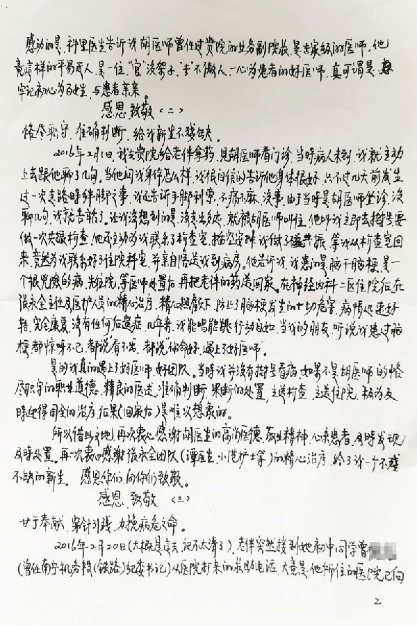 我要为神经内科二区张永全医师团队的精准治疗,成功挽救危重病人的壮举点赞,也为胡医师这位曾经的院长,现在的专家,为挽救病危的生命,放下院长之身段,甘于奉献,为患者穿针引线,四方联系的大爱精神点赞。谢谢你们,我们永远不会忘记你们为病人所做的一切,向你们致敬。