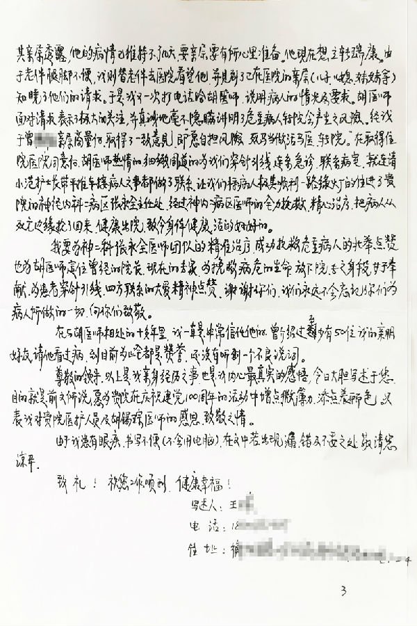 尊敬的领导,以上是我亲身经历之事,也是我内心最真实的感悟,今日大胆写述于您,目的就是前文所说,愿为贵院在庆祝建党100周年的活动中增点微薄力,添点美丽色。表达我对贵院医护人员及胡锡琮医师的感恩、致敬之情。