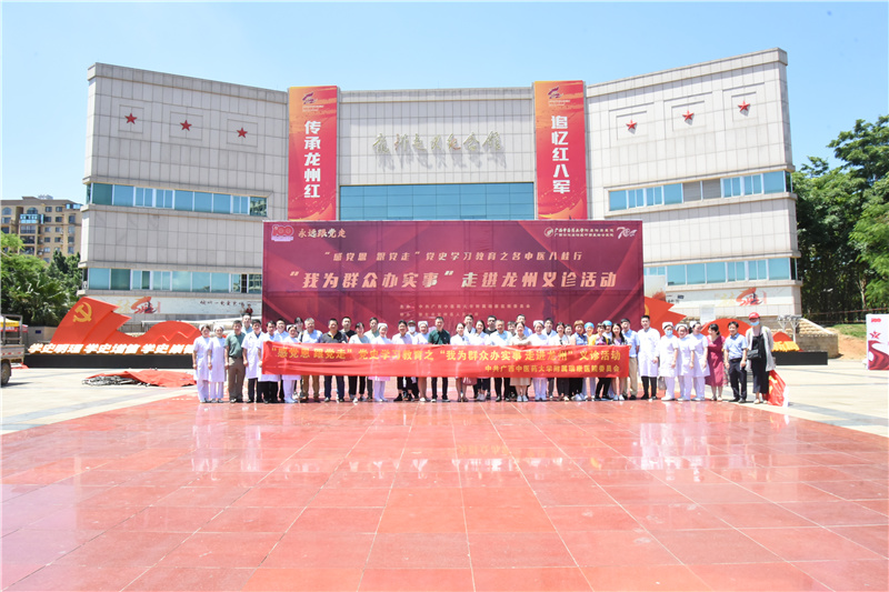 为庆祝中国共产党成立100周年,深入贯彻落实习近平总书记在党史学习教育动员大会上的重要讲话精神,切实做到学史明理、学史增信、学史崇德、学史力行,推动党史学习教育走深走实,助力国家乡村振兴战略实施,6月19日上午,“感恩党 跟党走”党史学习教育培训暨名中医八桂行之“我为群众办实事 走进龙州”义诊活动在龙州县红八军纪念广场举办。医院党委书记高宏君,党委委员、副院长、总会计师庞刚,党委委员、纪委书记黄建民,出席开幕式。广西中西医结合研究所所长龙学明,以及来自全院各科室组成的医护专家团队、医院各党总支、党支部书记、民主党派及无党派人士代表共计67人参加活动,本次活动得到了当地政府的大力支持。