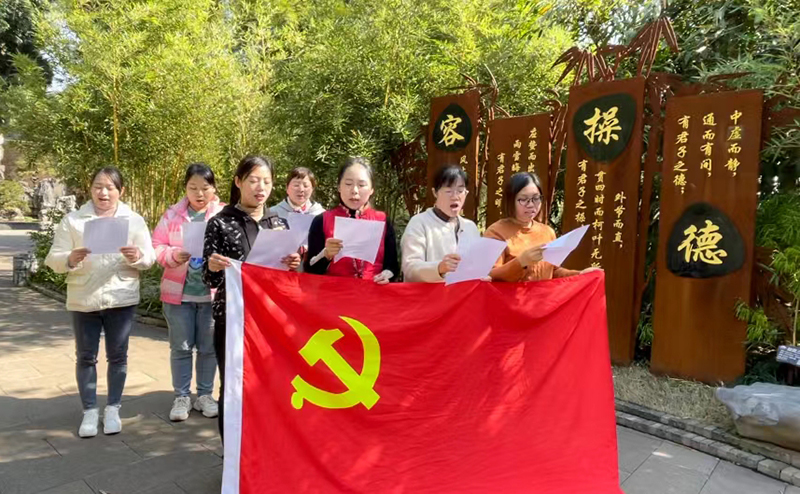 在竹园,支部书记玉华带领全体党员,面对党旗,庄严诵读《中国共产党章程》。伴随着熟悉的诵读声,同志们回想起最初入党宣誓时的庄严承诺和党章赋予的重要政治使命。