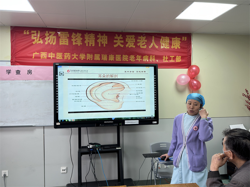 活动开始,潘晓日护士长运用多媒体,以图文并茂的形式为在场病友及家属们讲解道:“我们小小的耳朵上分布着93个穴位,全身器官和组织在这里都有特定的反射区,经常揉揉耳朵能达到疏经活络,调节气血,调理五脏的功能。”接着,她向大家现场演示了培元固本耳廓按摩操,通过按摩就可以达到提高免疫力,延缓衰老,改善老年人生活质量的效果。