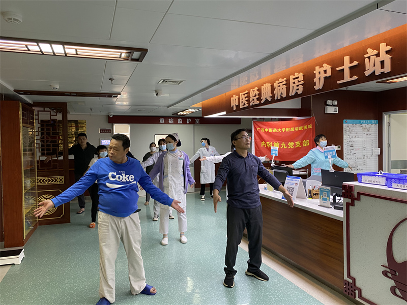 患者们积极响应号召,每日与党员专家团队在护士站舒展筋骨、放松形体的身影,成为了病房里一道靓丽的风景线。八段锦是一套独立而完整的健身功法,它具有动作简单易行,效果显著的特点,能够调心、调息,宣畅气血,升发阳气。不少患者表示,打完一套八段锦,身体微微发热,出了不少的汗,感觉通体舒畅。