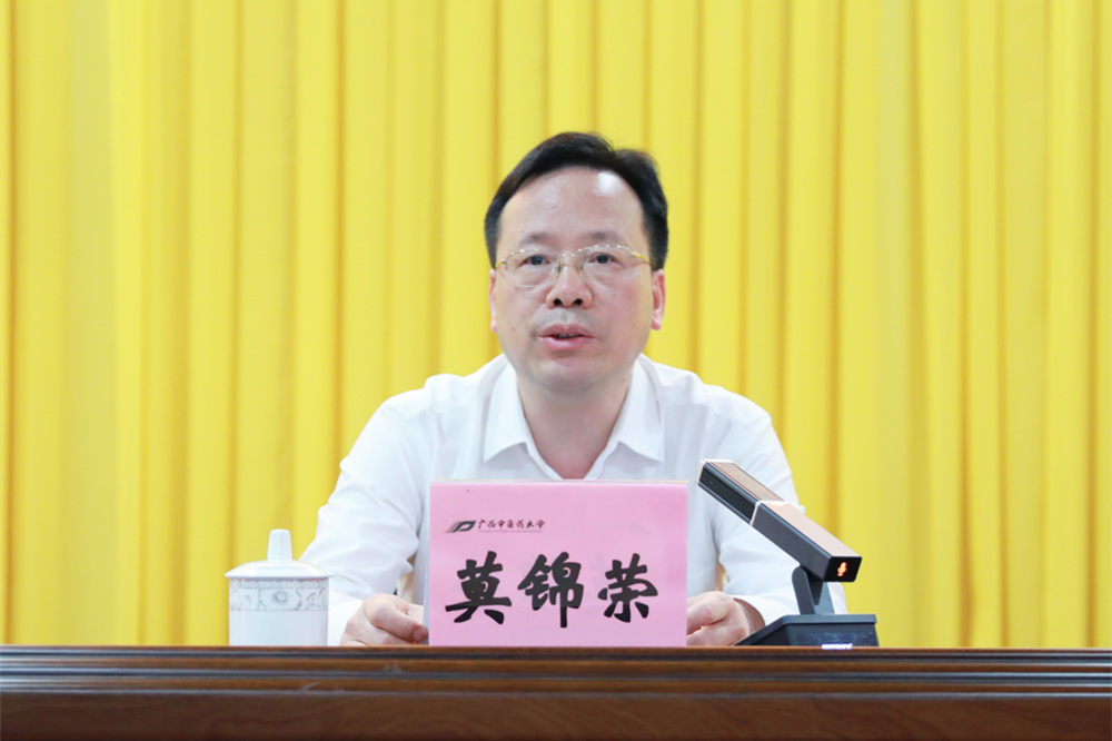 莫锦荣要求加强组织领导,压实工作责任,注重统筹兼顾,坚持守正创新,加强宣传引导,把开展主题教育与学习贯彻习近平总书记对教育、中医药和广西工作的重要指示批示精神结合起来,同贯彻落实党中央和自治区党委各项决策部署结合起来,同推动学校中心工作和日常工作结合起来,同学校正在开展的本科教育教学审核评估等重点工作结合起来,统筹科学安排,做到两手抓、两促进,采取灵活多样的形式开展主题教育,出彩完成自选动作,确保主题教育取得实实在在的成效。