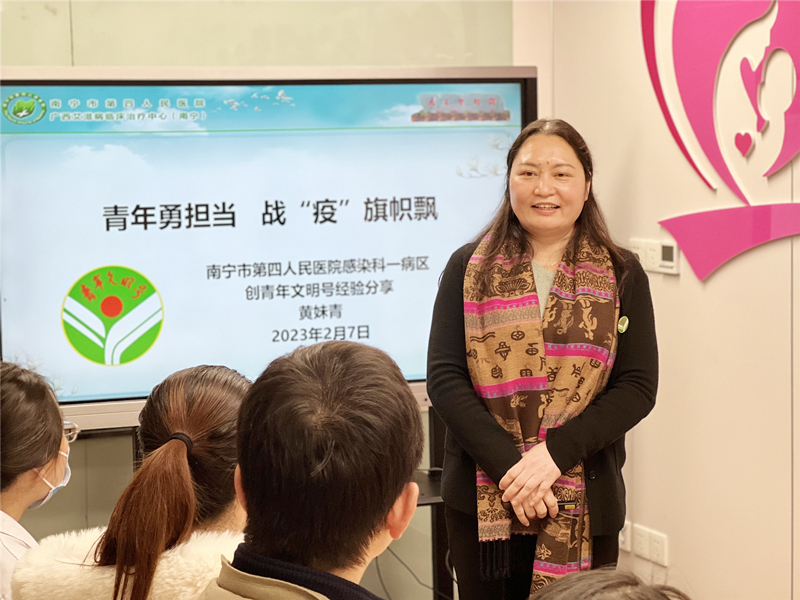 本次活动邀请了南宁市卫健委团工委书记唐胜海、“全国五四红旗团委”南宁市第四人民医院团委书记韩璐歆、“全国青年文明号”南宁市第四人民医院感染科一病区护士长黄妹青分别讲述青年文明号创建故事,以创建“五个一流”为切入点,介绍了创建青年文明号的实际情况,并与大家分享了创建的经验。