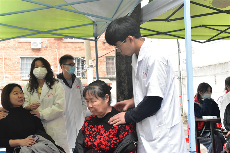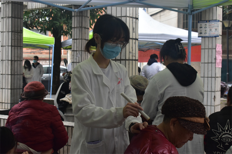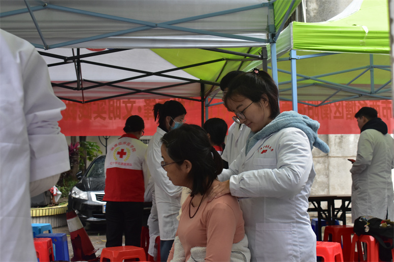 活动现场,前来参加义诊的居民络绎不绝,志愿者们热情引导居民有序排队等候。此次义诊活动免费为居民提供测量血压、手法按摩等服务,针对居民的健康问题,志愿者们也耐心给出了解答,同时还开展了急救知识宣传活动。前来咨询的多为老年人,他们主要受颈椎、肩膀等部位疼痛困扰,志愿者们通过询问了解到老人的身体状况后,结合所学知识,一对一进行艾灸或按摩。志愿者手法娴熟,用双手在患者身体各个穴位上进行揉搓、推拿、拍打,来促进血液循环,缓解患者疼痛。整个活动现场洋溢着幸福融洽的氛围,受到了居民们的一致好评。