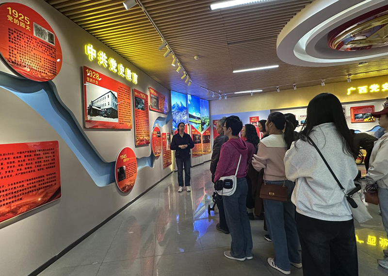抵达基地后,大家共同观看学习了中共党史、广西党史、党性体检、榜样教育、廉政教育等板块内容。各板块图文资料再现了从中共一大到中共二十大波澜壮阔的百年征程和革命先辈不屈不挠的英勇斗争,形象展示了雷锋、焦裕禄、李延年、张富清、黄大年等各个时代各条战线涌现的榜样力量和党风廉政建设的举措成效,大家边走边听,边看边学,不时为先辈、榜样们的英雄事迹和崇高精神所触动,真正懂得了今天的美好生活来之不易,更加珍惜拥有的美好,更加奋力走向更辉煌的未来。在“时代楷模”黄文秀肖像前,大家都停下了脚步,黄文秀同志放弃大城市的繁华,毅然回到家乡,在脱贫攻坚第一线倾情投入、奉献自我,用美好青春诠释了共产党人的初心使命。党员们被她的精神深深打动,纷纷表示要以黄文秀为榜样,在自己的岗位上坚守初心、勇于担当。