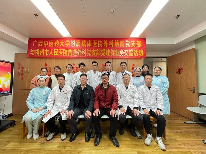 王德胜欢迎梧州市人民医院普通外科党支部党员专家到我院交流学习。座谈会上,韦建宝和梧州市人民医院普通外科党支部书记区军杰分别介绍了各自支部基层党建工作的经验和成效。双方支部党员围绕基层党支部建设工作、临床实践工作、个人学习体会等方面展开了讨论,并分享了学习领会自治区党委书记陈刚同志在坚持“解放思想、创新求变,向海图强、开放发展”推动经济高质量发展大会上的讲话精神的感悟。双方一致认为,推进党建与业务发展,加强党建工作的引领带动,是科室高质量发展的必要保证,是形成发展新格局,科室员工凝心聚力的有效路径。