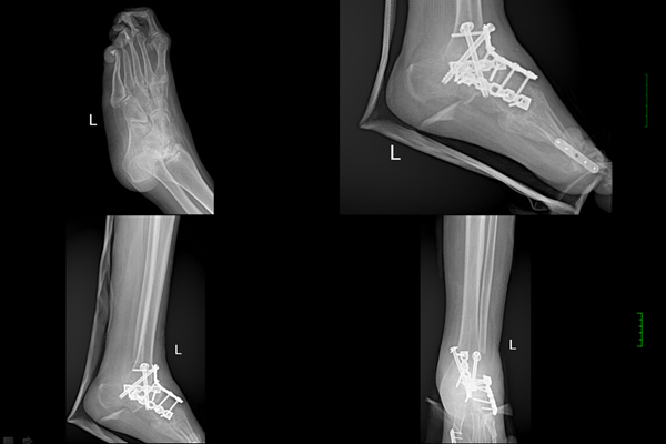 在家人的陪同下,刘永环老人于6月来到我院骨四肢二区进行了首次手术:成人先天性马蹄内翻足四关节融合术及?外翻关节融合术。经过丰哲教授的精心设计和手术,经外侧腓骨截骨手术入路,进行截骨矫形及四关节融合及?外翻第一跖趾关节融合术。手术取得圆满成功, 刘永环老人的脚畸形得到矫正,她为此笑得合不拢嘴。经过骨四肢二区医护人员的精心护理,刘永环老人于六月底带着石膏康复出院。