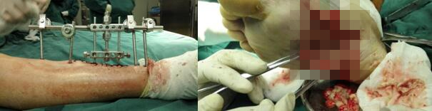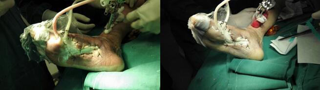 注:可调外固定支架与支架密封保护及足底创面清创。