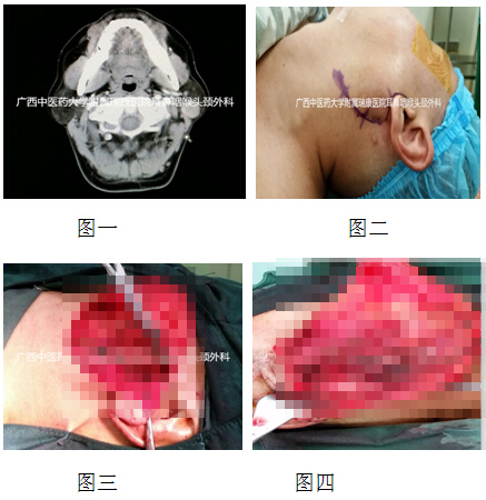腮腺疾病是颌面头颈外科的常见病、多发病,其中又以腮腺肿瘤常见。临床上大多患者以自行发现腮腺区无痛性肿块就诊,常无特殊不适,其病理性质复杂,表现多样,良性肿瘤以多形性腺瘤和沃辛瘤最为常见,恶性肿瘤以黏样表皮癌和腺样囊性癌较为常见,临床上常借助彩超、CT或MRI(图一)及穿刺活检来明确诊断,如肿瘤性质明确,无论良恶性,均建议尽早采用手术治疗。良性肿瘤选用经典的术式,即颌面部S型切口(图二),解剖并保留面神经的腮腺部分浅叶(图三)、浅叶或深叶加肿瘤切除术;恶性肿瘤采用腮腺全切或扩大切除术(图四),手术的难点在于面神经及腮腺的解剖及其功能的保护。术后易出现面瘫、腮腺区凹陷畸形、面部瘢痕、味觉出汗综合征(Frey综合征)及涎漏等并发症。