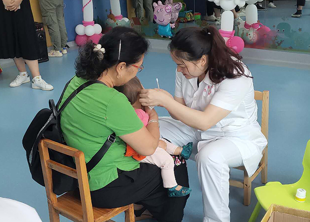 贴耳豆:活动开始前,给每一位参加活动的小朋友贴保健耳豆,关爱每一位小朋友,表达我们希望他们健康成长的心愿。