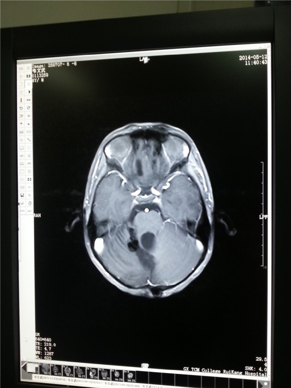 2011年4月初,家住南宁市的5岁男孩文文因反复头痛、呕吐而到南宁某区级医院就诊,经磁共振检查考虑为脑肿瘤。4月12日行开颅肿瘤切除术。手术后病理报告为:胶质细胞瘤2级。术后稍好转出院。但术后文文出现行走不稳,易摔跤的情况。
