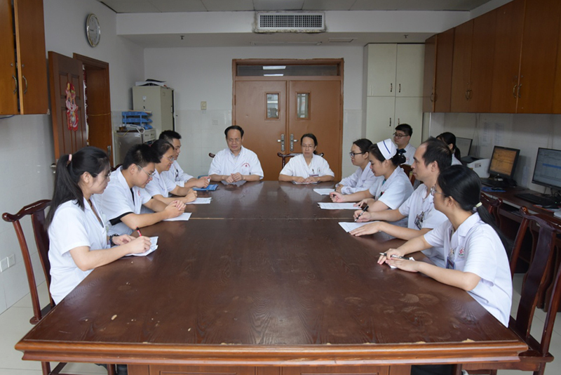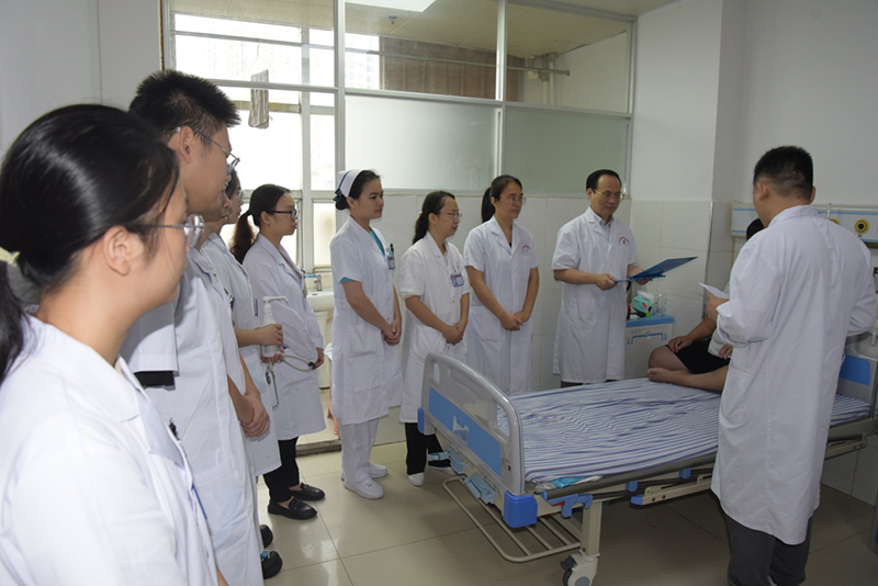 随后,专家团队深入内分泌风湿免疫科病区进行查房及疑难病例讨论。在查房环节,庞学丰教授在听取了主管医师对病人病史以及目前的治疗方案和治疗情况的详细汇报后,对患者进行体格检查,详细分析和讲解了目前的处理方案、预后及治疗要点,评估及判断了患者病情,并耐心为医护人员答疑解惑,为患者制定详细治疗方案。在病例讨论环节,庞学丰教授以“强直性脊柱炎的规范化治疗”为题,结合多年临床经验,通过病例分析,针对患者病因病机、发病季节、发病特点、临床表现,开具了治疗方药。同时与内分泌风湿免疫科的医护人员就中医特色诊疗技术、专科疾病诊疗方案以及学科建设等多方面进行了讨论和研究,进一步拓展了医护人员的临床诊断及临床管理思路,提升了对疾病的诊治能力。