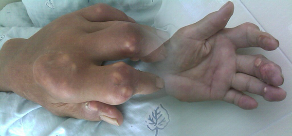 慢性期痛风为病程迁延多年,持续高浓度的血尿酸未获满意控制的后果,痛风石形成或关节症状持续不能缓解是此期的临床特点。结合X线或结节活检查找尿酸盐结晶,不难诊断,此期应与类风湿关节炎、银屑病关节炎、骨肿瘤等相鉴别。