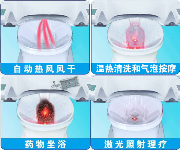 激光坐浴机,将激光的生物刺激作用,结合热水坐浴、气泡按摩、热风风干,配合中药熏洗共同作用于人体病变组织和经络穴位,从而促进血液循环和代谢,改善机体免疫功能,达到消炎、镇痛、加速病变部位受损组织的修复,加快愈合的目的。应用在肛肠科、男性科、妇科术后,能够有效缓解术后伤口疼痛、出血、水肿、分泌物增多、愈合缓慢等问题。