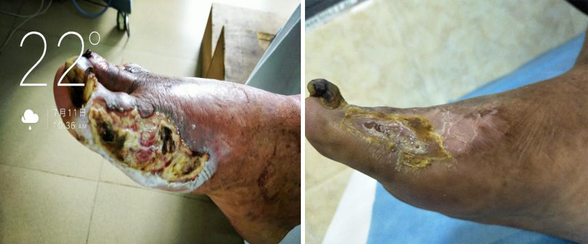 糖尿病足,局部血糖高、血运差,污染重等因素往往会导致坏死并需截肢。该病是目前我科收住并治愈较多的病种。