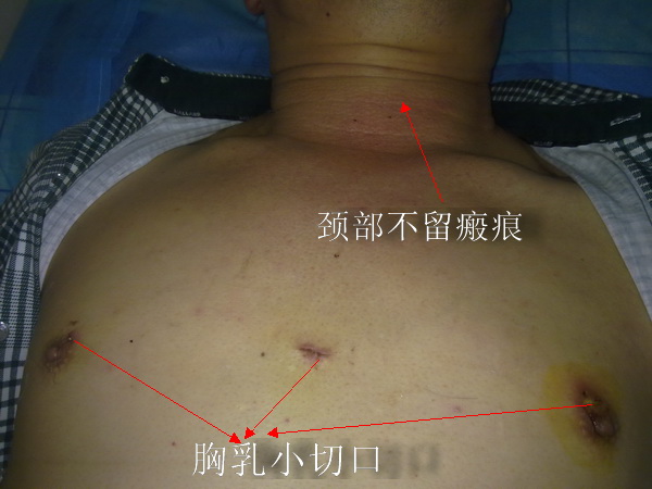 患者张某,男,患有甲状腺肿瘤多年,近年来肿瘤进行性增大,彩超提示8*10cm,严重影响了张某的美观及生活。为此,张某慕名来我院进行手术治疗,传统的手术治疗对于张某来说,颈部6~10cm 的“自刎”切口,在美观上难以接受,可由于甲状腺肿瘤巨大,操作空间狭小,实施腹腔镜手术操作难度极大。我科韦杨年主任凭借丰富的经验,机智的临场应变能力,熟练的腹腔镜操作技巧,成功为张某实施了腹腔镜下甲状腺手术,满足了张某对美容的要求,也积累了经验。