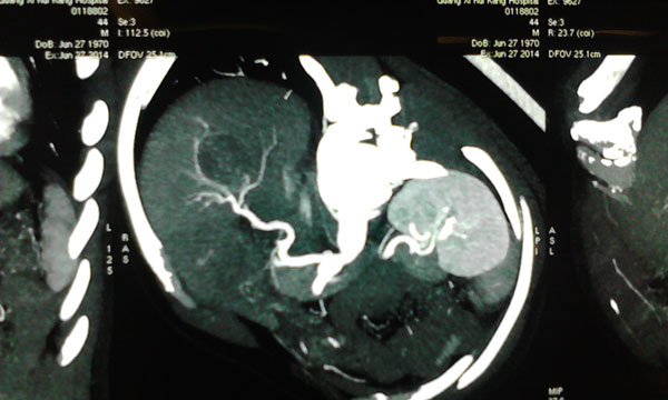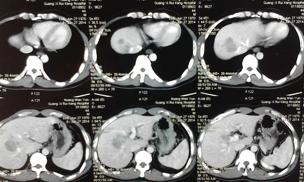 患者确诊为原发性肝癌,肿瘤位于肝脏的ⅦⅧ段,侵犯肝右静脉,与肝中静脉关系密切,必须行右半肝全切除,残留肝体积需达到标准肝体积的40%左右才能保证术后肝功能正常,而患者的残留肝脏体积仅占标准肝体积的30%,传统上认为达不到手术切除的要求。韦杨年主任决定采用世界肝脏外科革命性的二步肝切除技术。