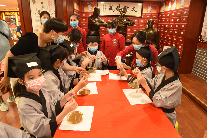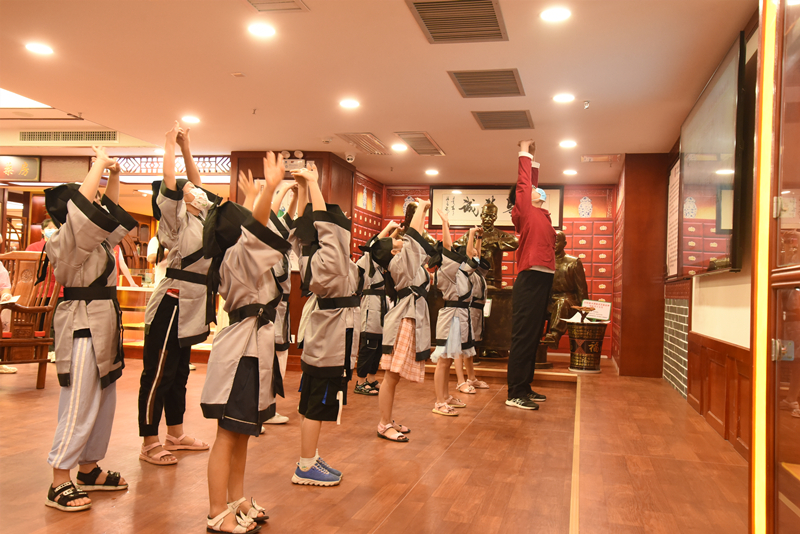 参加此次活动的小学生化身“小郎中”和学生家长,在医院医疗服务部组织下参观国医大师馆、院史馆、国医堂、治未病中心、正骨推拿理疗馆、针灸科和中医药博物馆,体验中医药文化,感受中医药的文化和特殊魅力。在参观的过程中,志愿讲解员通过深入浅出的讲解,为同学们介绍了生活中的中医知识、中医四诊方法、药食同源的常见药材等。在中医药博物馆,“小郎中”们聆听了关于各类动植物标本、中医药经典书籍和器具、历代中医药伟人及人体经络等方面的知识,中医师们还采用学练八段锦、品养生药茶、听中药故事、做中药贴画等方式开展互动,引导小朋友们探索中医药的奥秘,很好地激发了他们对中医药文化的兴趣。