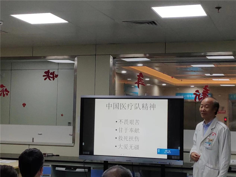 支部书记刁志宏同志最后总结:顾主任用两个小时时间给我们讲述了责任感和使命感都无比震撼的援非工作经历,从中我们了解了非洲情况,了解了党中央、国家坚持援外医疗的任务和意义,对推动人类卫生健康共同体的建立有着非凡的影响,顾主任代表广西,代表我们医院,代表我们支部做出了非凡的贡献,希望全体党员及科室成员都能牢记“中国医疗队精神”,践行“瑞康精神”,继续为守护人民健康做出自己的贡献。