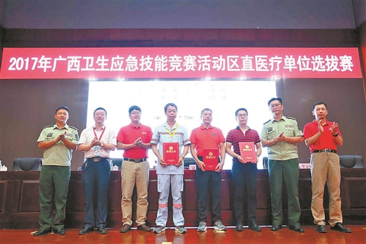 自治区卫生计生委举办的2017年广西卫生应急技能竞赛区直医疗单位选拔赛,考验的是医务人员在紧急情况下的处置能力。比赛分为五个环节:笔试,三项单人操作(心肺复苏、气管插管、止血包扎),以及综合操作(脊柱损伤搬运)。