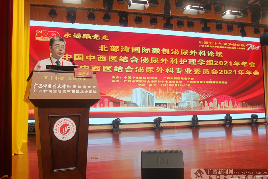 广西新闻网南宁5月29日讯(记者 李冠宏 通讯员 覃超)为庆祝中国共产党成立100周年、广西中医药大学附属瑞康医院建院70周年及举行“永远跟党走”系列活动,同时进一步提高广西泌尿外科微创诊疗技术水平,促进我区泌尿外科专家与国内外专家的学术交流与合作,由中国中西医结合学会、广西中西医结合学会主办,广西中西医结合泌尿外科专业委员会和广西中医药大学附属瑞康医院共同承办的“北部湾国际微创泌尿外科论坛暨2021年中国中西医结合泌尿外科专业委员会第一届护理专题年会暨广西中西医结合泌尿外科专业委员会2021年年会”,5月28-30日在南宁举行。