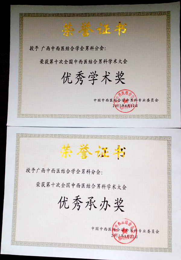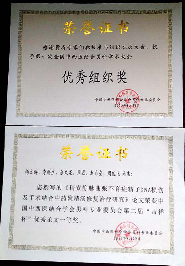 我院男科主任杨文涛教授除主持大会开幕式外,受大会邀请做题为《精索静脉曲张中西医结合认知及诊疗策略》的专题报告,受到与会专家学者高度评价。我院男科在此次会议有10余篇学术论文参加交流,其中论文《精索静脉曲张不育症精子DNA损伤及手术结合中药聚精汤修复治疗研究》荣获中国中西医结合男科专业委员会第二届“吉祥杯”优秀论文一等奖。在杨文涛主委的带领下,广西中西医结合男科学会荣获全国第十次中西医结合男科学术大会优秀承办奖、优秀组织奖、优秀学术奖等卓越成绩。同时我院男科杨文涛博士被聘为《男科单病种中西医结合诊疗指南》编委会编委。