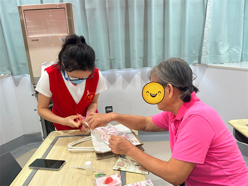 在制作蝶古巴特帆布包环节,病友们在医护人员、志愿者的协助下,剪切出不同图案的花纹纸巾粘贴在空白帆布袋上。很快,具有个性的蝶古巴特帆布包制作完成,大家都骄傲地展示着她们的成果。