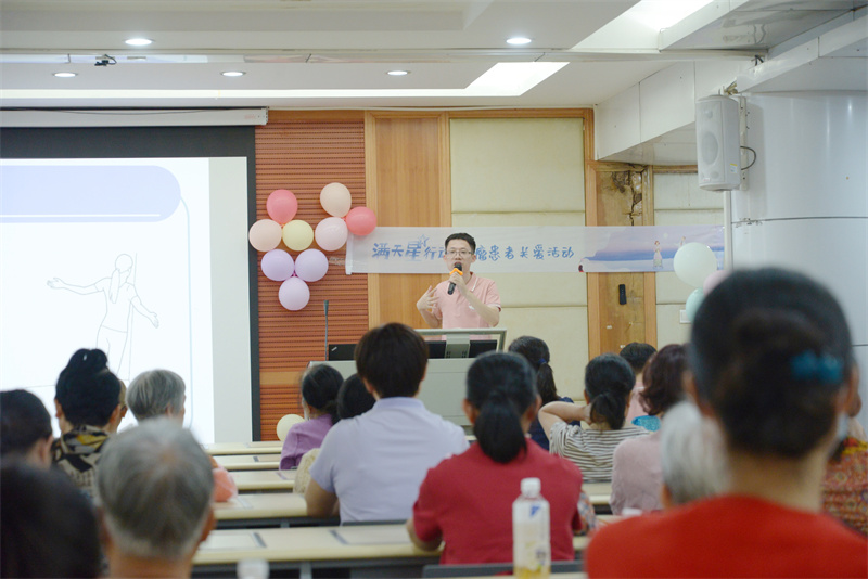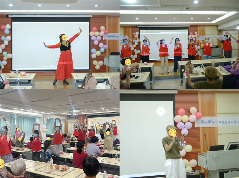 在有奖问答的间隙,病友们带来了精彩的才艺表演,婀娜多姿的新疆舞让大家感受到了不屈生命力,演唱的经典老歌蕴含着对美好生活的向往。我院志愿服务队还为大家带来了温馨柔和的歌唱表演,将现场氛围推向高潮。随后,志愿者及八段锦爱好者上台为大家展示八段锦全套动作,病友们纷纷跟着一起拉伸筋骨、疏通经络,达到强身健体、防病治病的目的。