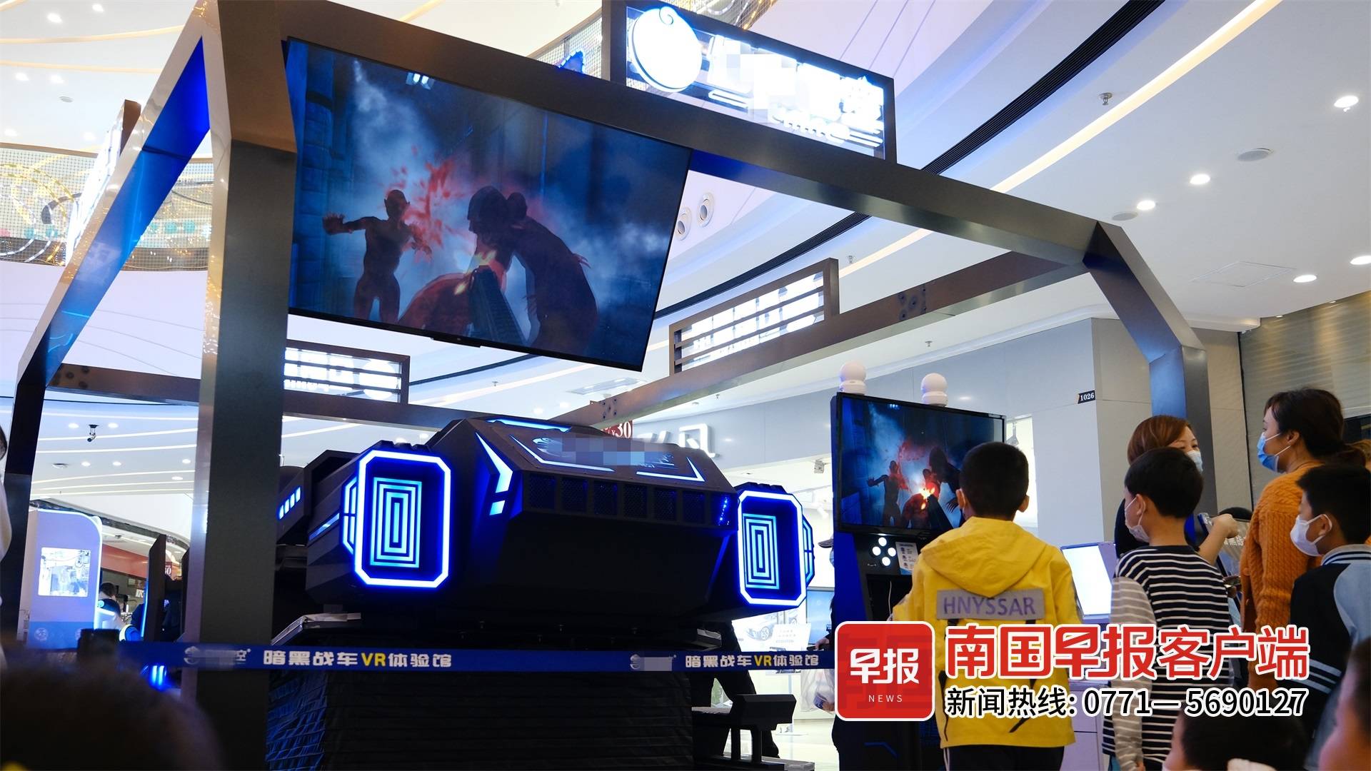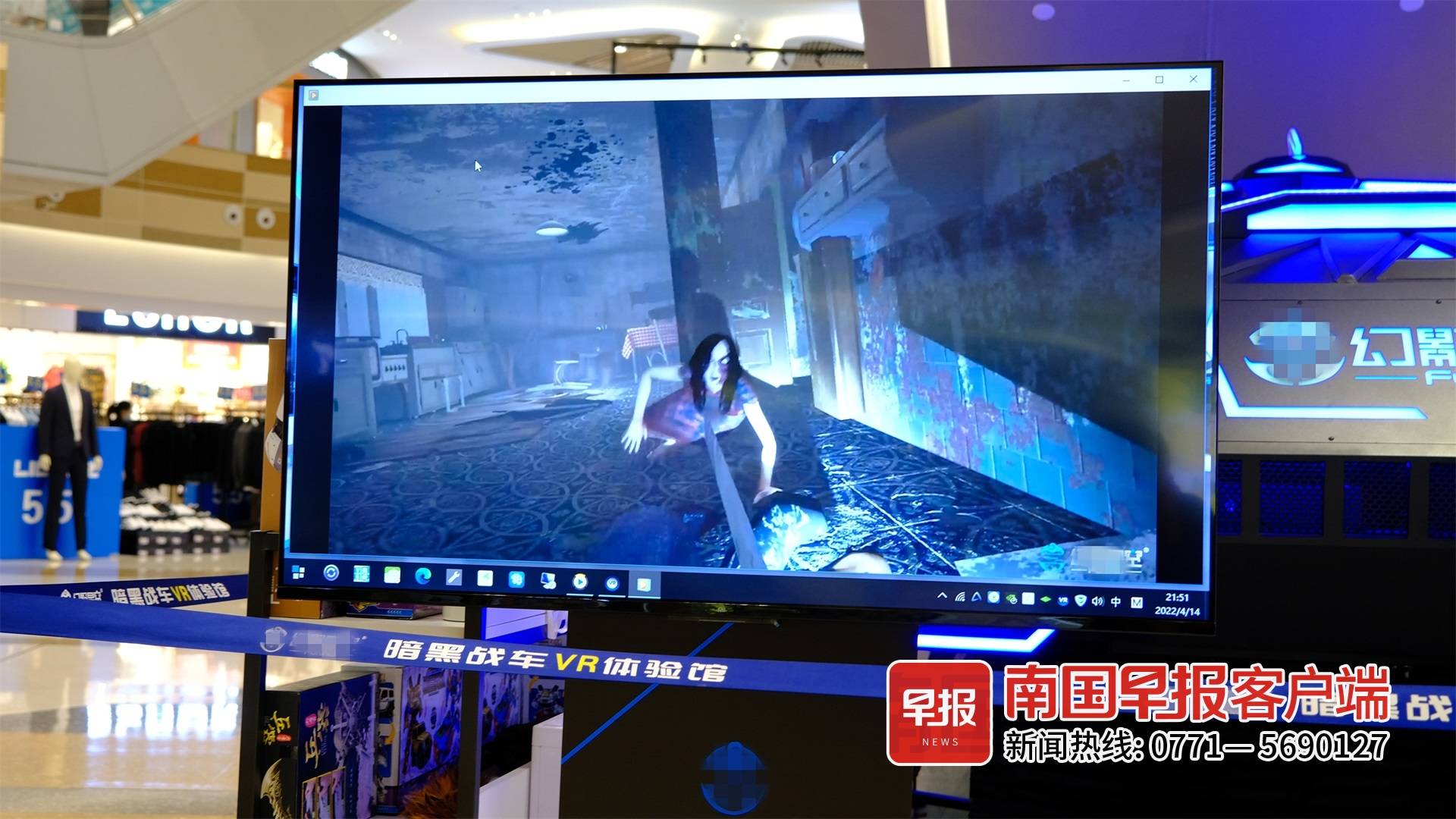 ▲南宁明秀东路一商场内,一VR体验场所播放着有恐怖元素的宣传视频。