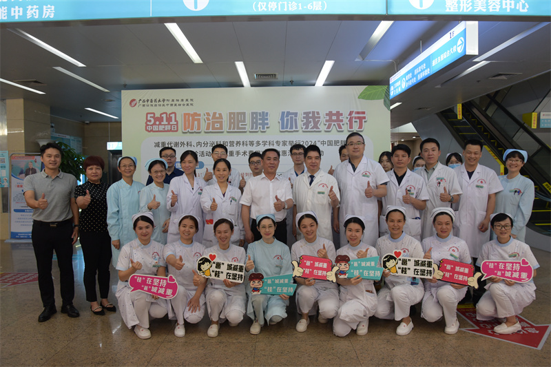 唐友明院长指出,目前,全世界及我国肥胖人群均呈逐年增多的趋势,超重和肥胖症的防治意义重大。2019年来,我院胃肠、减重代谢外科在韦建宝主任带领下较好地开展了微创减重代谢外科手术。目前我院是广西开展此类手术例数和术式类别较多的医疗单位之一。今天,由我院胃肠外科、减重代谢外科、内分泌科和营养科等多学科专家在这里开展全天的“中国肥胖日”义诊活动,并启动为期一个月的“减重手术费用减免优惠活动”活动,将为更多有意通过减重手术解决肥胖症问题的病友带来福音。相信我院强大的中西医结合技术实力,一定能够为广大深受超重和肥胖症困扰的病友们带来帮助,为全区人民群众的身体健康提供坚实保障。
