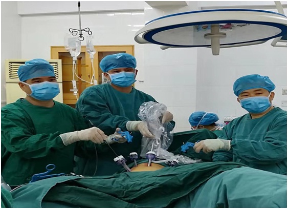 韦建宝主任与隆安县中医医院外科骨干一起进行腹腔镜直肠癌(NOSES)根治术