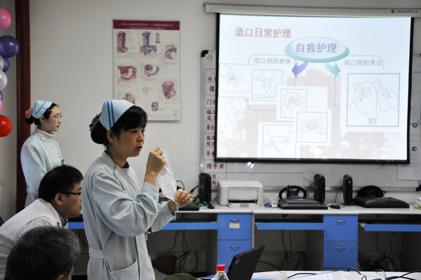 我院李鲜造口师随后以“造口日常护理及饮食选择”为主题,用图文并茂的PPT展示、通俗易懂的语言,从造口术后日常饮食、运动、休闲等各方面作了精彩的讲解,并演示了术后造口袋的规范使用方法、流程及注意事项,深受在座造口人士及家属的欢迎。