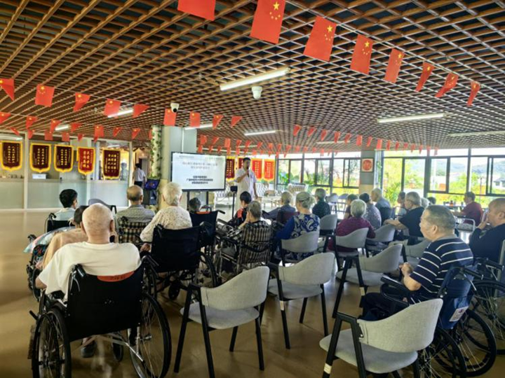 在广西重阳老年公寓,修复重建显微外科副主任兰荣玉为养老公寓的医务人员作阿尔兹海默病专题知识讲座,并免费为老年公寓的老人进行阿尔茨海默病筛查以及认知功能评估和健康咨询服务。