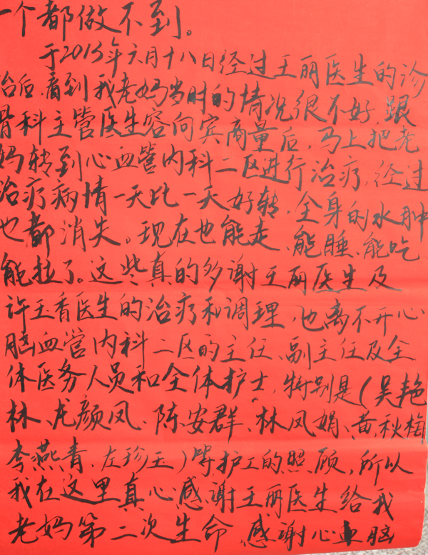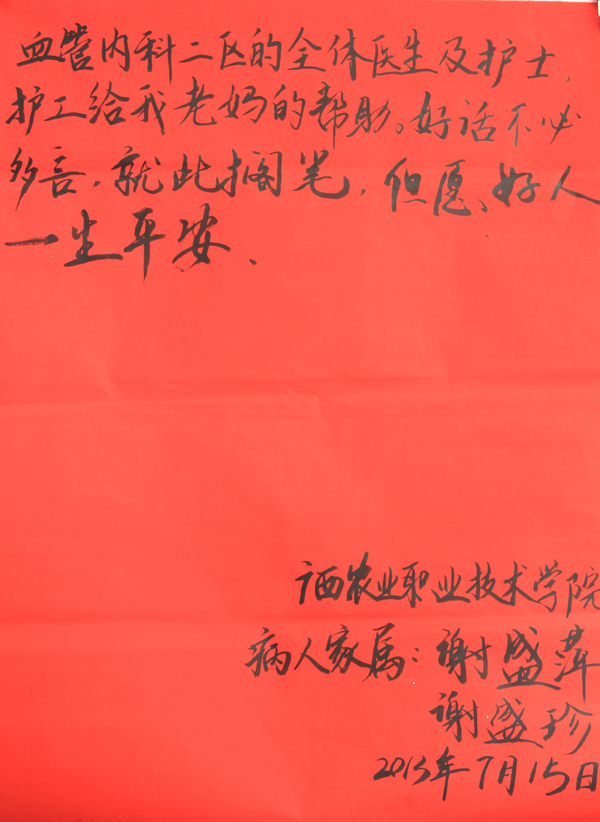 于2013年六月十八日经过王丽医生的诊断后,看到我老妈当时的情况很不好,跟骨科主管医生容向宾商量后,马上把老妈转到心血管内科二区进行治疗,经过治疗病情一天比一天好转,全身的水肿也都消失。现在也能走,能睡,能吃,能拉了。这些真的多谢王丽医生及许玉香医生的治疗及调理,也离不开心血管内科二区的主任、副主任及全体医务人员和全体护士,特别是(吴艳林、龙颜风、陈安群、林凤娟、黄秋梅、李燕青、左珍玉)等护工的照顾,所以我在这里真心感谢王丽医生给我老妈的第二次生命,感谢心血管内科二区的全体医生及护士、护工给我老妈的帮助。