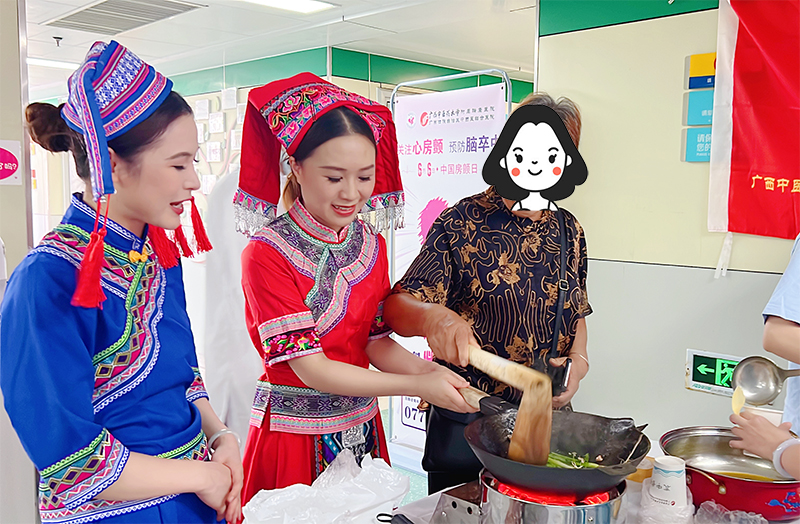 在欢声笑语中,穿着民族服饰的黄静和蓝玉菲两名护士带领着大家开始制作传统的打油茶。她们熟练地将茶叶、花生、葱花、葛根等材料放入锅中进行捶打,再倒入热腾腾的开水,顿时,一股浓郁的香气在空气中弥漫开来,患者们好奇地围观,更是亲自动手一起打油茶。