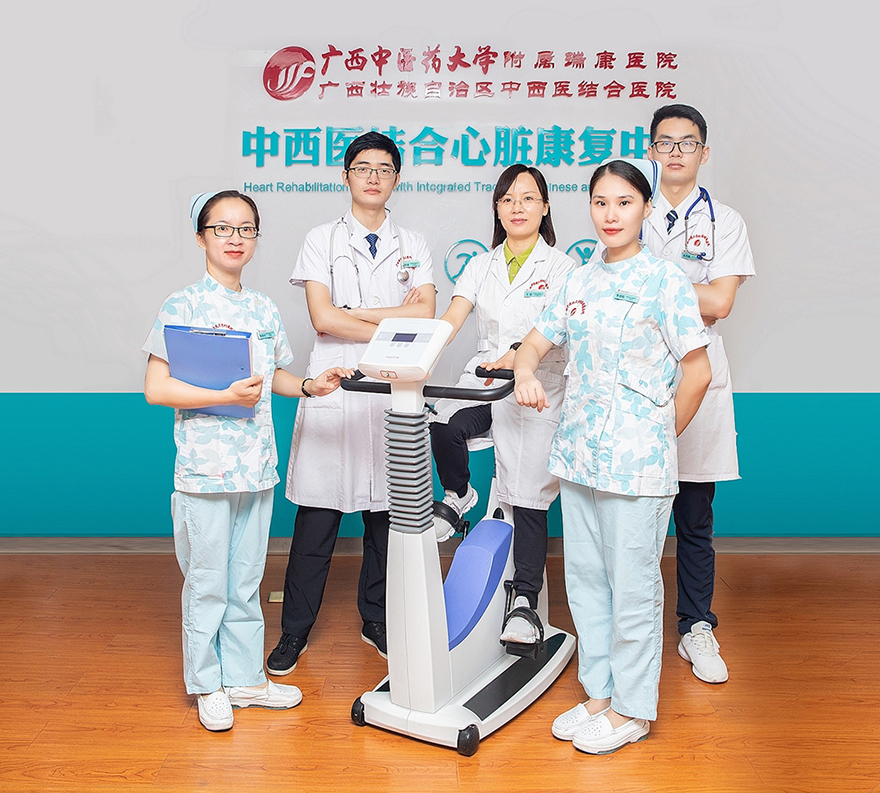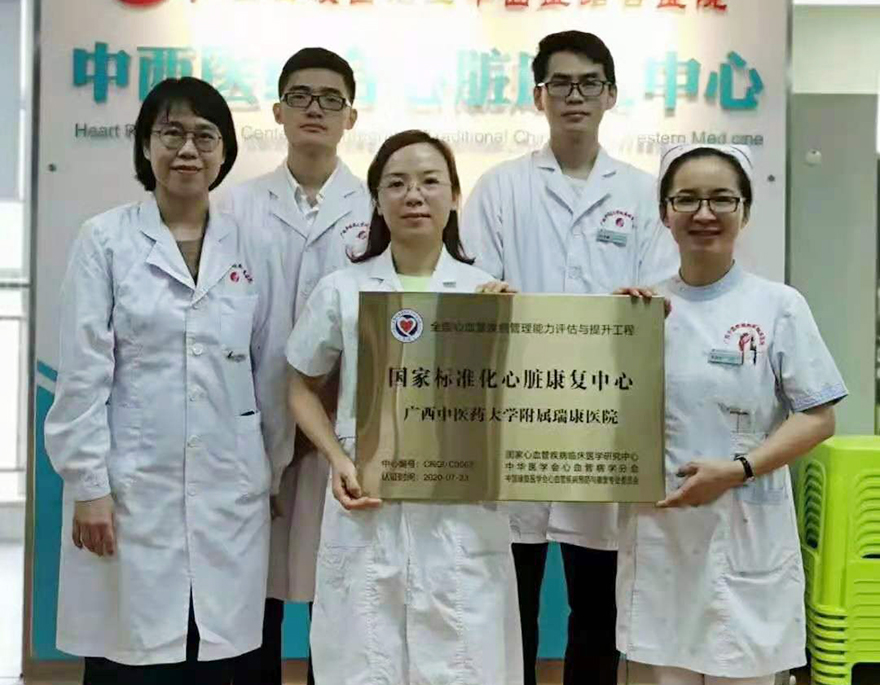 广西中医药大学附属瑞康医院中西医结合心脏康复中心于2017年12月正式成立,2019年7月获批成为广西首家国家级心脏康复中心,2020年7月经全国心血管疾病管理能力评估与提升工程(CDQI)认证为国家标准化心脏康复中心。科室现有医护人员6名,医生3名,护士2名,专职治疗师1名,其中高级职称3名,硕士研究生学历3名。