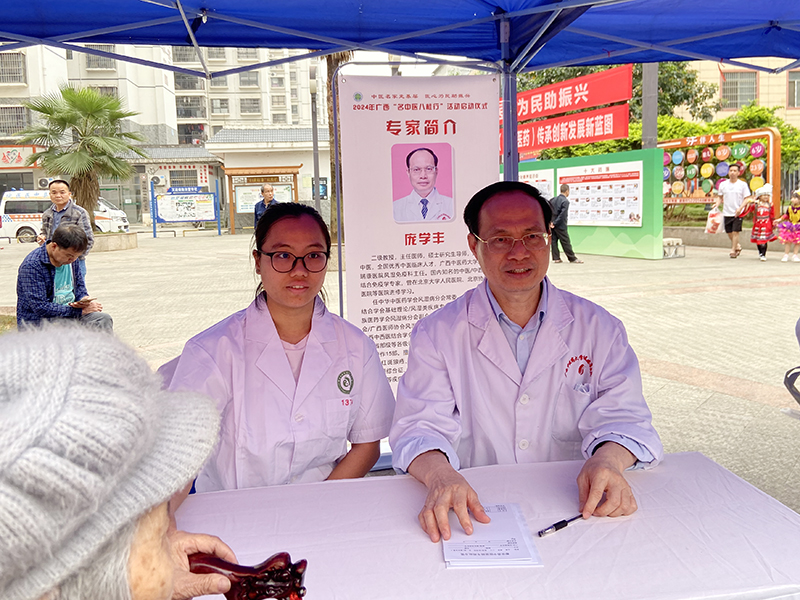 庞学丰广西名中医传承工作室积极响应上级部门的号召,派出庞学丰教授、林菊主治医师参加此次活动。3月30日早上,在参加完于都安县密洛陀公园广场举行的开幕式后,庞学丰教授、林菊主治医师与其他名中医一起深入到都安县澄江镇仙琅社区开展义诊和健康宣讲,将高水平中医服务送到搬迁安置社区群众家门口,展现了中医药服务特色优势,受到居民们的热烈欢迎,也得到了居民们的一致好评。