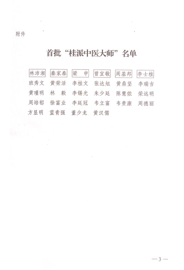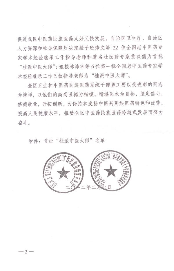 为贯彻落实《广西壮族自治区人民政府关于加快中医药民族医药发展的决定》,营造名医辈出的良好氛围。广西卫生厅、人力资源和社会保障厅决定授予班秀文等22位全国老中医药专家学术经验继承工作指导老师和和著名壮医药专家黄汉儒为首批“桂派中医大师”,其中我院有9名,分别是:班秀文、李桂文、荣远明、周培郁、徐富业、李廷冠、韦贵康、方显明、蓝青强;追授林沛湘等6位第一批全国老中医药专家学术经验继承工作已故指导老师为“桂派中医大师”。