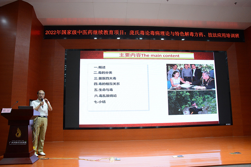 此次培训班紧密围绕庞氏毒论毒病理论,重点就特色解毒技法以及其他少数民族医学对“毒”的认识与研究进行了深入探讨。会议共设6场学术报告、7个专题培训讲座。学术报告环节以庞宇舟教授作《八桂庞氏学派毒论、毒病与治疗原则概述》主报告开始,对庞氏毒论的病因病机,毒病的概念、分类与临床特点,毒病的治则治法进行了系统的介绍。梁明坤博士以《从毒病辨治癌症的临床实践》为题,结合自身临床实践,分享了从“毒病”辨治癌症的经验。蒋伟哲教授就《基于毒论的解毒壮药金草消毒颗粒的研究与开发》对壮药制剂金草消毒颗粒的研究与开发进展进行介绍,为民族医药的新药开发提供了整体思路与成功案例。