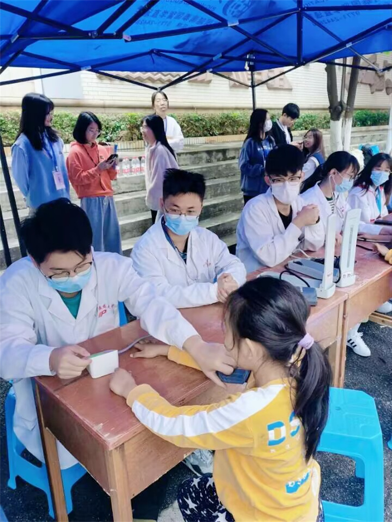 下午三点,义诊队伍顺利抵达目的地,井然有序完成了相关准备工作。伴着细雨,朝气蓬勃的志愿者们怀着饱满的服务热情开始工作,负责宣传的志愿者手拿健康知识宣传册,向路过的同学、老师们科普健康知识,宣讲健康生活态度;负责健康义诊的志愿者则身披白大褂,他们有的在为老人们测量血压,一边耐心叮嘱他们养成良好的生活习惯,一边引导他们树立防护意识;有的在为老师同学们进行手法按摩,娴熟精巧的手法赢得一众称赞。