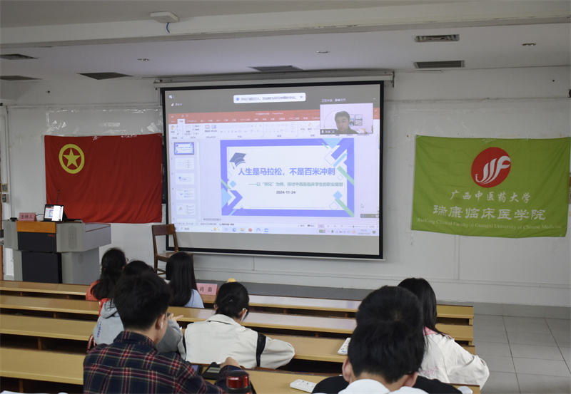 为了引导同学们明确学习方向,提升专业学习认知,开拓医学视野,提高专业学习兴趣,进一步推动中西医临床医学专业的学科建设和人才培养,11月24日下午,瑞康临床医学院在明秀校区西梯二教室举办了主题为“人生是马拉松,不是百米冲刺”的中西医临床医学职业规划讲座。讲座邀请了我校2013级中西医临床医学专业的优秀毕业生,目前就职于武汉市第一医院(武汉市中西医结合医院)的陈卓作为主讲嘉宾。学生科主任王瑜及辅导员肖苗出席本次讲座,2021级、2022级中西医临床医学专业学生聆听讲座。