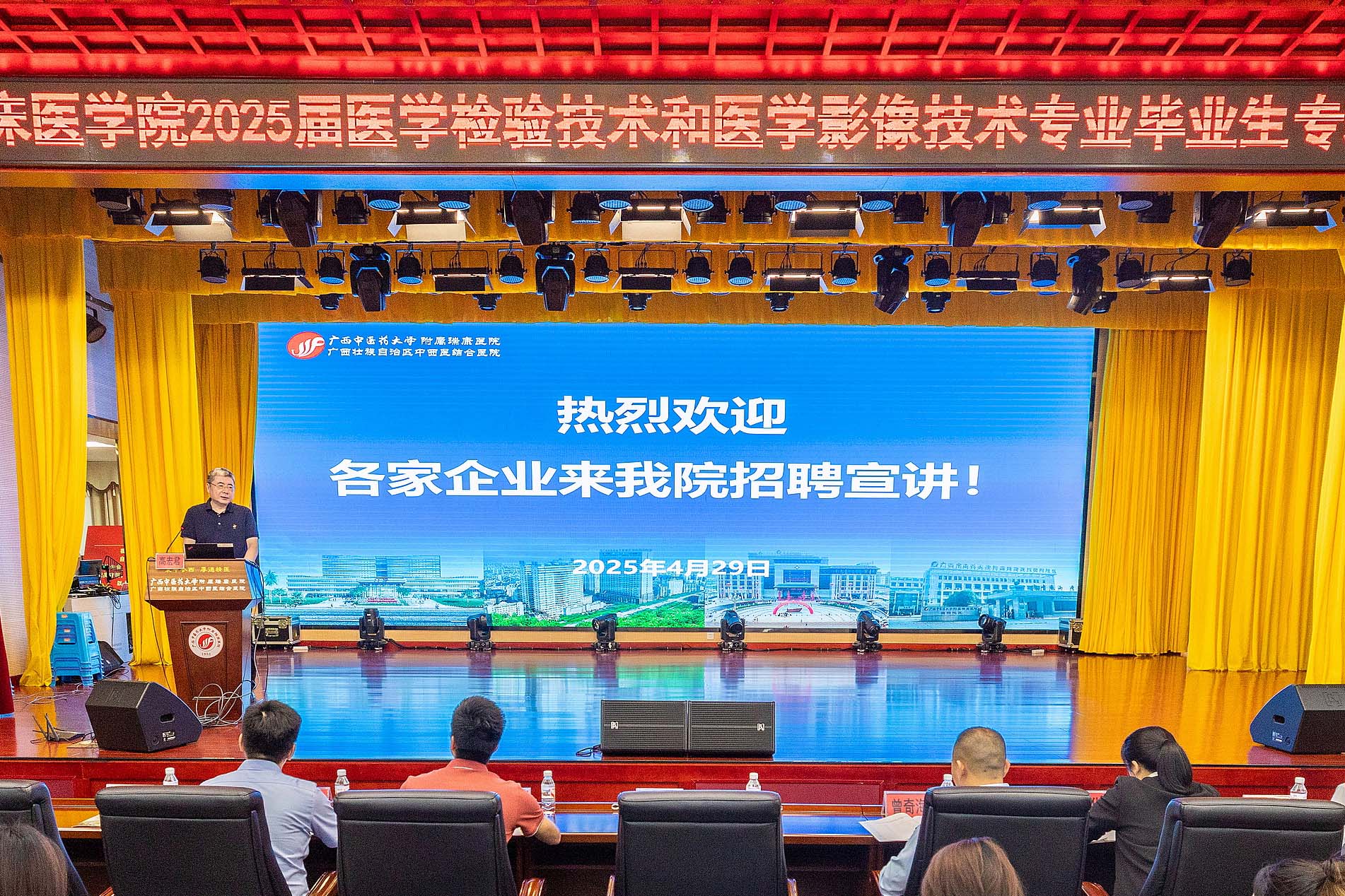 为促进我院2025届医学检验技术和医学影像技术专业毕业生高质量就业,4月29日下午,我院在B座十楼学术报告厅举办了2025届医学检验技术和医学影像技术专业毕业生专场招聘会。学校招就处副处长丁天全,医院党委书记高宏君、党委副书记王德胜、纪委书记彭定基出席会议,检验科、学生科、医学影像科负责人,深圳迈瑞南宁分公司、广西北部湾创新投资有限公司等9家企业代表以及150余名2025届毕业生参加会议。会议由王德胜主持。