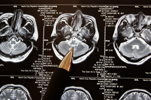 覃伯的脑部CT片显示脑干病灶