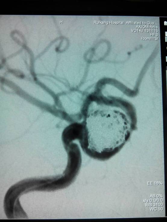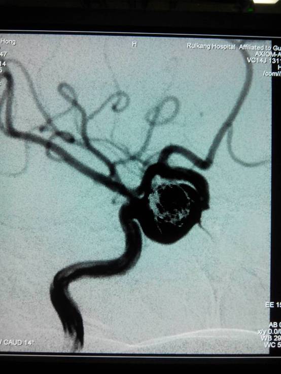 经神经外科主任范学政博士及副主任黄进能等多位专家会诊,确诊为左颈内动脉海绵窦段巨大动脉瘤,在经患者家属同意后,医院神经外科专家经过讨论,迅速制定了手术和麻醉方案,3月23日,吴英被推进了手术室。3个小时后,动脉瘤被成功栓塞,吴英的脑部警报顺利解除。