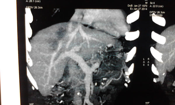 患者确诊为原发性肝癌,肿瘤位于肝脏的ⅦⅧ段,侵犯肝右静脉,与肝中静脉关系密切,必须行右半肝全切除,残留肝体积需达到标准肝体积的40%左右才能保证术后肝功能正常,而患者的残留肝脏体积仅占标准肝体积的30%,传统上认为达不到手术切除的要求。韦杨年主任决定采用世界肝脏外科革命性的二步肝切除技术。