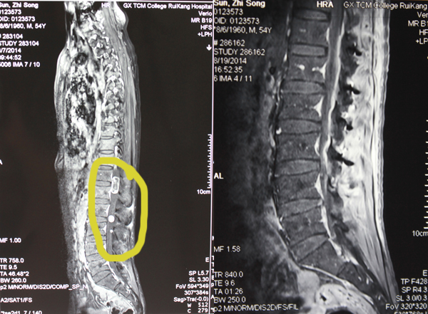 胡医生在分析治疗方案时说:“老孙椎管内的三个肿瘤分别为2.5*1.5cm,1*1cm,0.6*0.6cm,大小,从磁共振片上看,排在一起就像长了一串小果子。这样的多发性肿瘤在临床上是比较罕见的。”